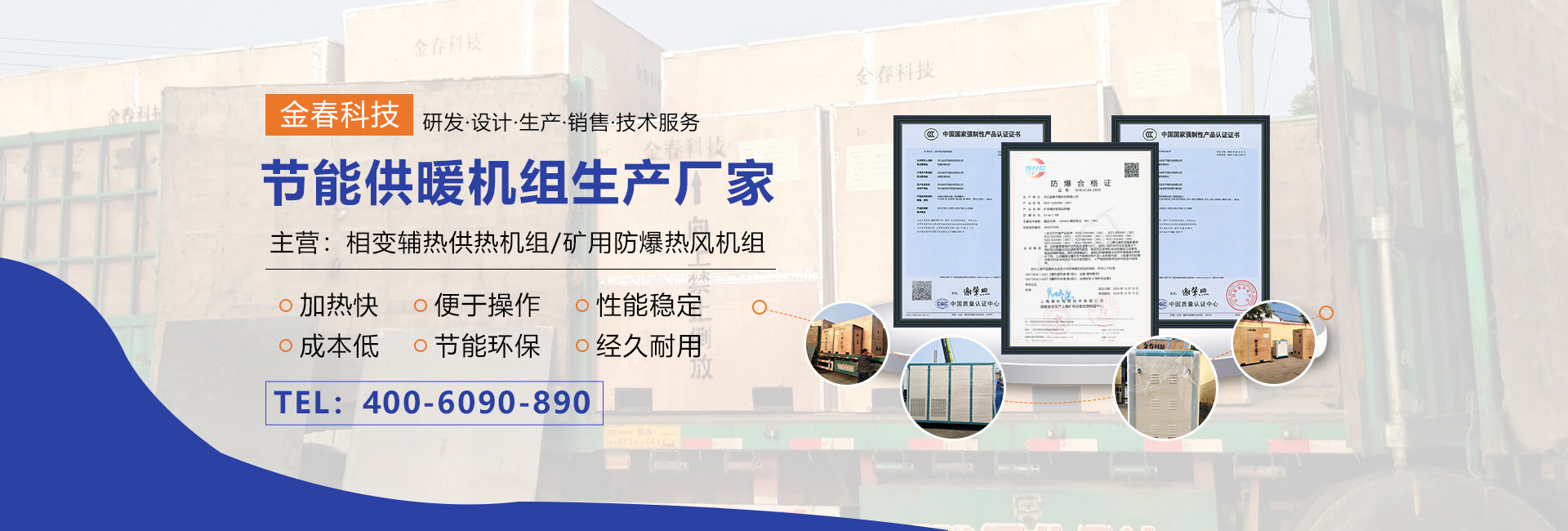 本公司專業生產相變輔熱供熱機組、礦用防爆熱風機組,可代替燃煤、燃油、燃氣鍋爐,運行成本低,具有加熱快、熱效率高、便于操作,節能環保等特點,是新一代理想的環保節能產品。